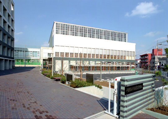 旧校舎の老朽化に伴う全面的な改築です。1階に柔剣道場やトレーニングルーム、2階に部室、3階にアリーナを設けた重層構造の体育館です。3階のアリーナ部分で校舎棟に接続されています。